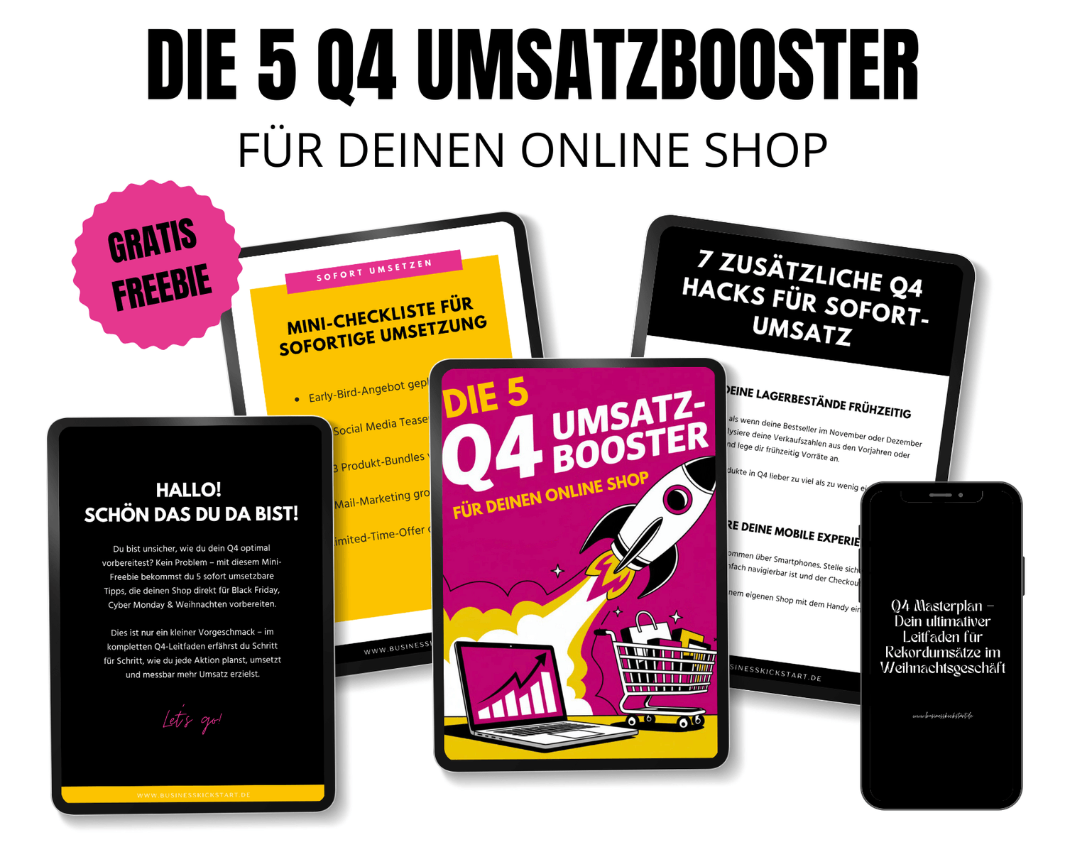 Mit meinem kostenlosen Freebie „Die 5 Q4 Umsatzbooster“ bekommst du sofort umsetzbare Strategien, die dich Schritt für Schritt durch diese umsatzstärkste Zeit führen.